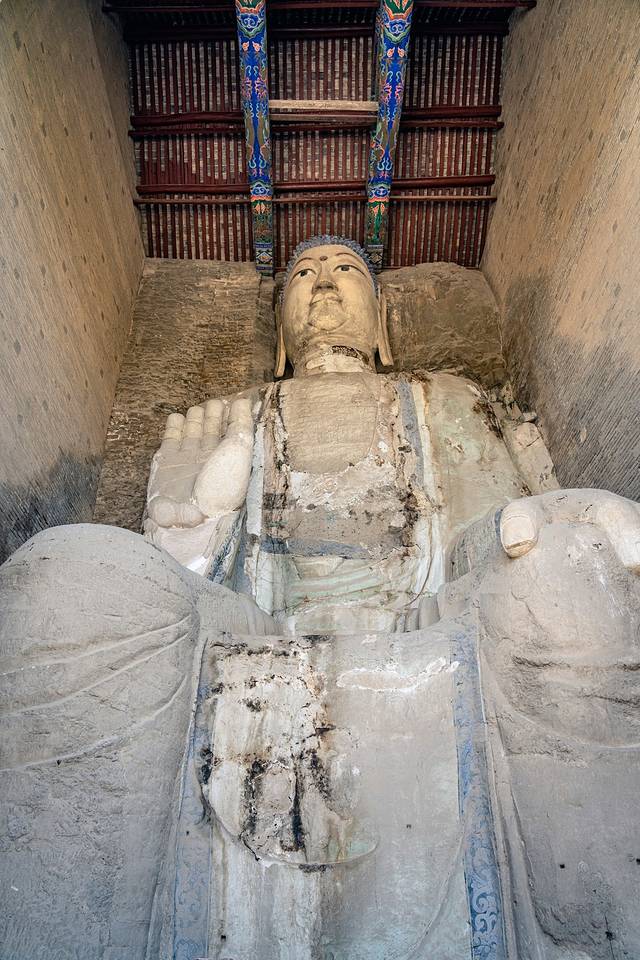 一如唐宋斗拱宽大笨拙,而进入清代即刻小巧精致一样,现代人眼中大佛略显潦草疏朗的外表,恰是穿越沧海桑田的证据。它来自1600多年前的十六国后赵时期,是“全国最早,北方最大”的摩崖造像。黄河古时流于大伾山脚下,每到雨季常会泛滥,故立石佛以镇之。明《浚县志》记载,后赵开国皇帝石勒听从高僧佛图澄的建议,兴建了这尊高22.29米的“大佛岩”,俗称“镇河将军”。大佛像的脚深入地下一丈深,地上七丈,便也有了“八丈佛爷七丈楼”的说法。不过后来,当大佛像在明代被盖上了一座石楼加以保护,这句话于是被解读出了另外一种更易读和直白的涵义。
