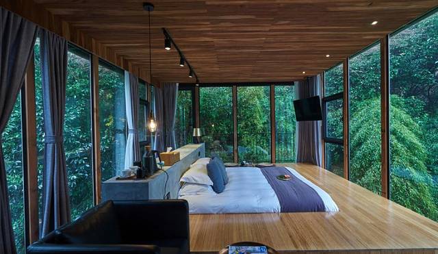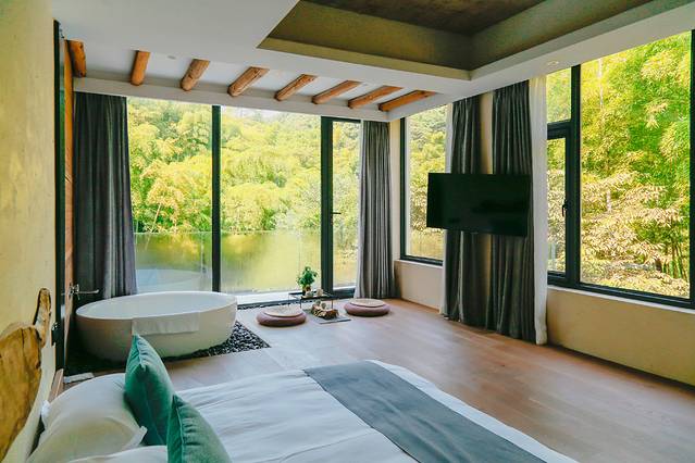 最网红的房间便是270度全景落地房【天青】,几乎天天满房,旺季的时候至少提前3个月才能订到 ,其他建议:【醉红】【竹语】【素枝】【月白】【茶香】拍照都很好看,这次我选择的是山院,竹林翠湖环绕,抬头望得星空,开窗听见溪流潺潺。
