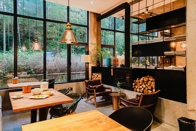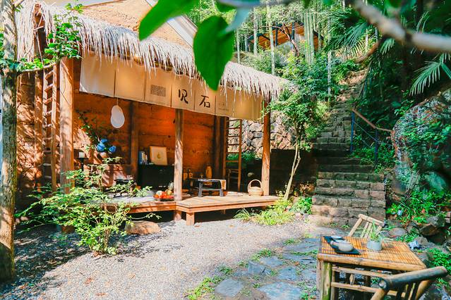 民宿一楼为公共厅堂大量利用全幅玻璃窗的设计,并将山体引入室内,视野与景观极好,外面美景尽收眼底,屋内很多小物件都是纯手工制作,器具也很精致。一本书,一杯茶,悠哉悠哉一下午。四周竹海,满眼翠绿,自然美景相伴,岂不快哉?