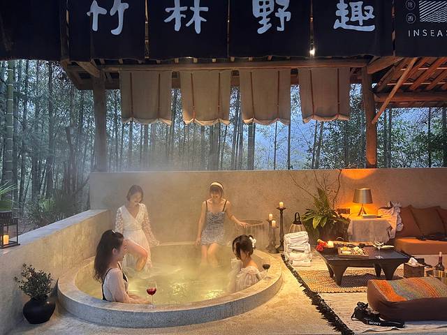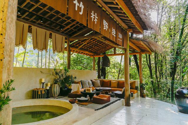 一泓温暖,隐于林间,泡着户外私汤,欣赏水光山色,诗情画意,别提有多美了,竹林私汤来自莫干山山泉水,私汤设置为圆形泡池,适合更多人围坐、泡汤、聊天。旁边有配套的沙发卡座小憩区,泡汤后可以在此喝茶、吃点心。