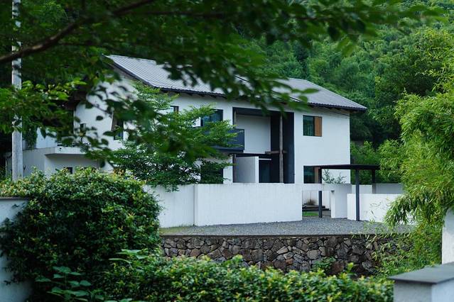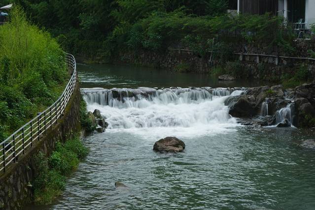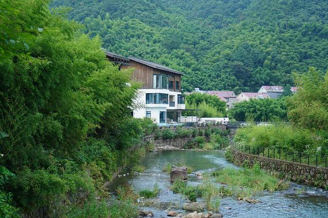 门前的溪水是从莫干山留下来的,穿流在石板丛林中,清澈见底,碧绿的颜色沁人心脾,偶有几级小瀑布,如银丝一般缠绕着这几栋院子
