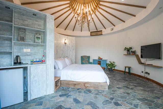 夯土小屋的构造采用了当下流行的简约风格,一张大床成了房间的主角,大自然的细节,略加设计,也可以是趣味横生的点缀……