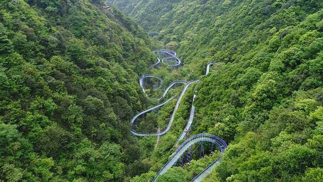 从高空航拍看去,紫龙峡玻璃漂流像一条巨龙盘旋在山野中,一趟漂下来大约十多分钟,如腾云驾雾,这种山林间的飞跃,让人流连忘返!当我真正从玻璃漂流上出发,多处S型、Z型和U型的弯道漂流大回环,激流勇进带来的刺激让我们一路尖叫,一路湿身。在高空中还可以一路观赏生态峡谷的美景,就连三岁的孩子玩了一遍又一遍,好玩刺激到根本停不下来。