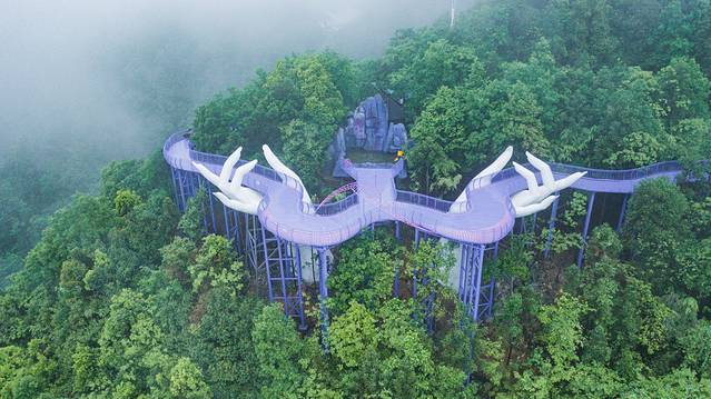 漫步于网红打卡点“紫绫纤手”,悬空在山林之间的紫色栈道,让天子地这如诗如画的美景更加令人心动,瞬间有一种心旷神怡的感觉,城市里的那些烦恼在美景面前烟消云散了。