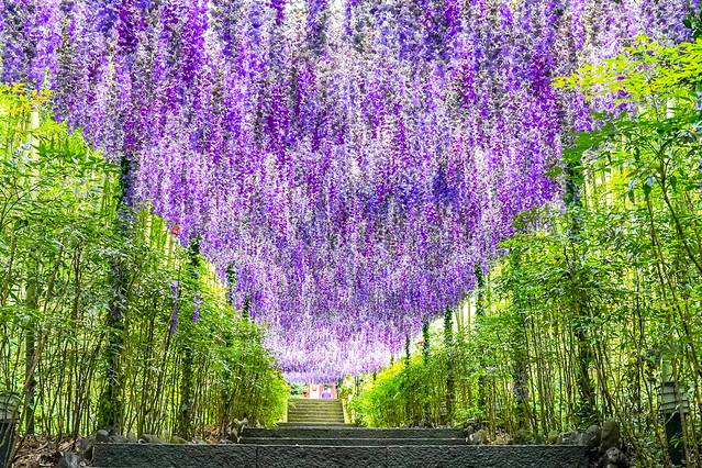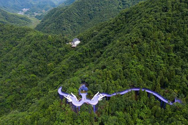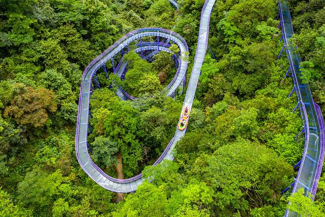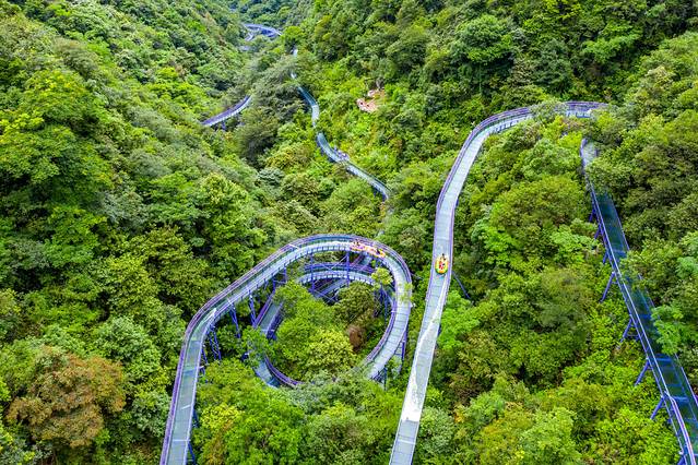 在郁郁葱葱的大山之间,在植被茂密的林瀑之间,玻璃水滑道婉转盘旋,但看玻璃滑道的外形,就足以震撼你的眼球,紫色的玻璃漂流也足够为这山间增添不少色彩。