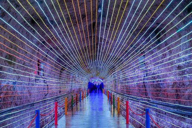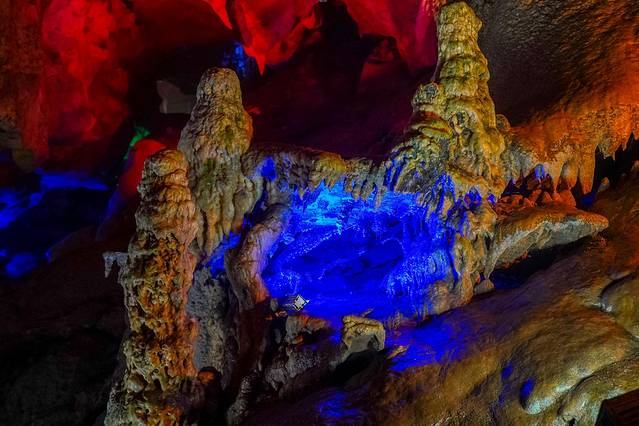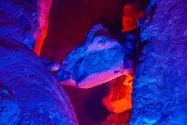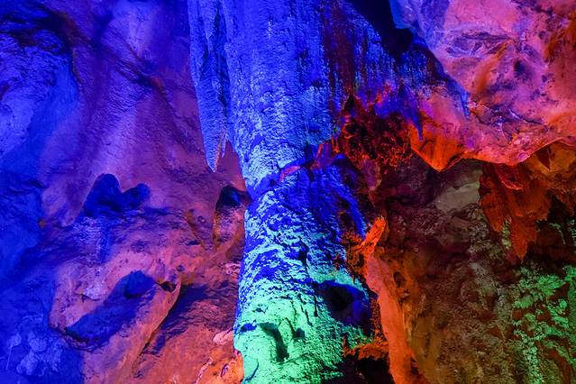 天子洞原名叫做仙人洞,因为天子刘裕游憩读书处之说,所以叫做天子洞。天子洞最前面一段,超级酷炫,灯光闪耀,好像穿越时光隧道一样,彩色的灯光不能变化着色彩,科幻大片的既视感,这个地方特别适合拍摄酷酷的打卡照,不少游客在这里拍照都会呆上半个小时,其实洞里是很冷的,建议穿上一件外套。