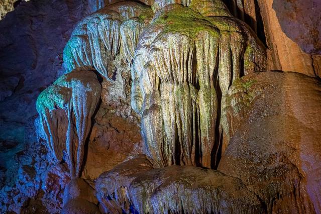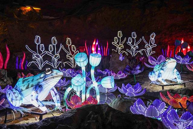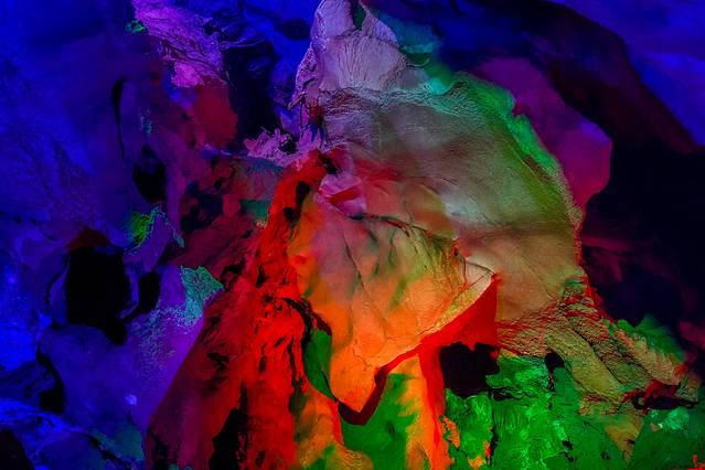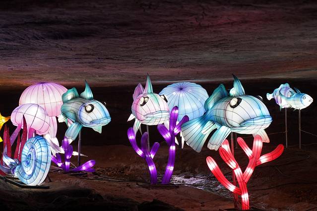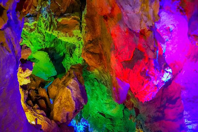 进入溶洞后,洞内的景象别开生面,让我十分惊叹,五光十色的彩色灯光将钟乳石照耀得熠熠生辉,仿佛像身处仙境,这些造型各异的石头都被赋予了传奇的色彩和故事,这还是我第一次见到这样的溶洞景致,走在溶洞中,如梦如幻。