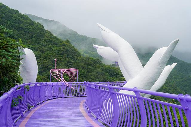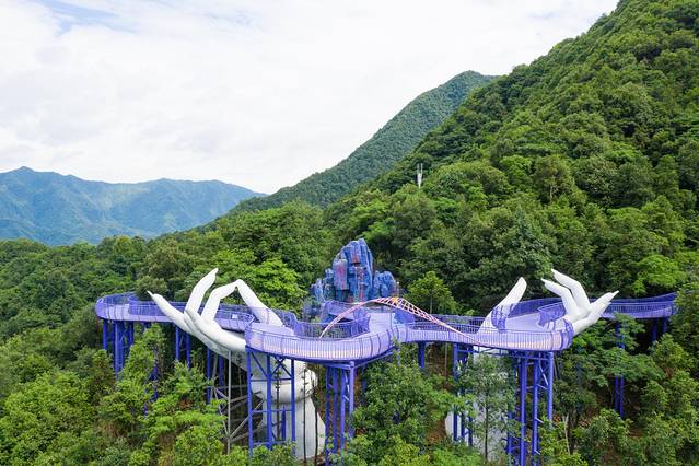 一条紫色的步行栈道悬空在山林之上,两个巨大的手掌拖着这条栈道,而手掌非常的纤细,人步行在栈道上面,就好似被巨大的手掌握在手心,这样的画面非常的魔幻。