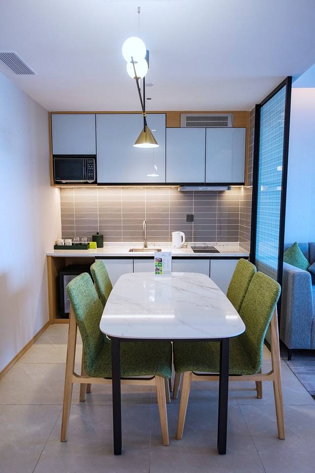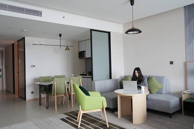 我这次入住的是60平米的单卧大床阳台套房,合理宽敞的空间布局,配有可做饭的厨房,温馨的卧室,干湿分离的洗手间。公寓式设计很有家的感觉,柔软的床品及布艺沙发,很容易让人躺着放松下来。