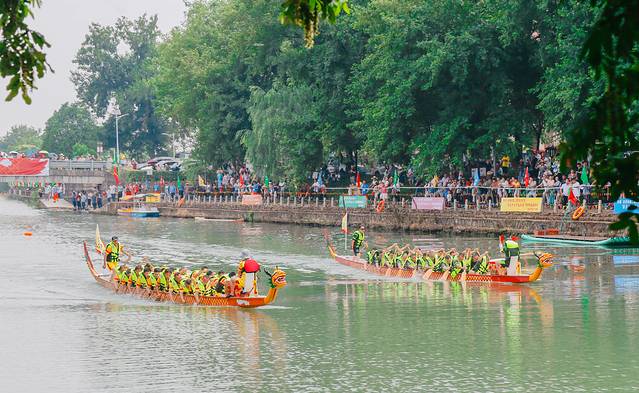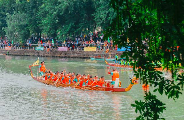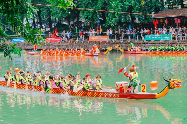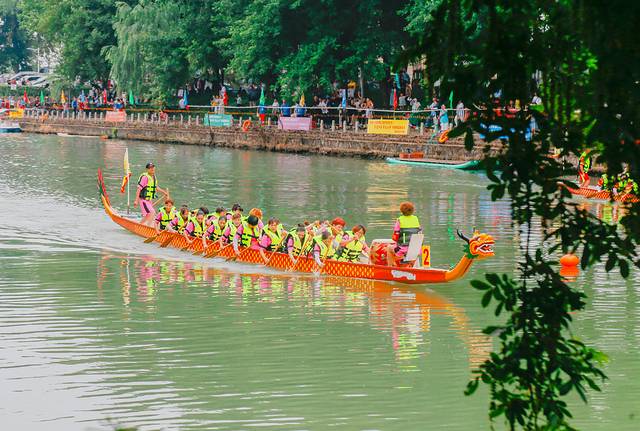 锣鼓声响起,浪花飞溅,浩瀚的江面,只见起跑线上龙舟如卧龙般蓄势待发。随着一声令响,船身便如离弦之箭向前疾行,鼓手擂鼓呐喊,划手们挥桨斩浪,转瞬之间,龙舟就从观众面前疾驰而过。