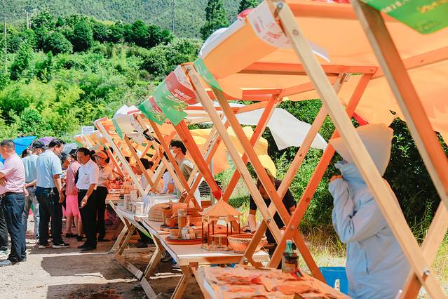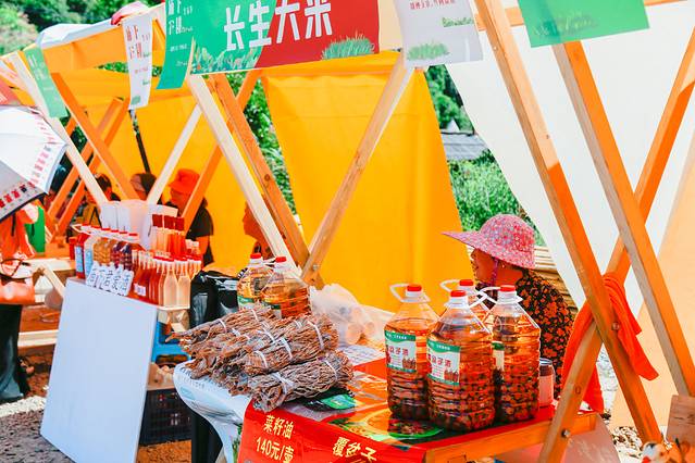 长生集市展示当地农户大山农特产,网红摊位,有竹林鸡蛋、自产笋干、农家自酿酒等特色农产品,现场还有主编手工表演,小吃零食销售,同时设置电商直播间,在抖音、淘宝等平台进行农特产品展销活动,直播产品包括特产生态大米、手工艺品、百乡特产等农耕食品。