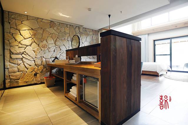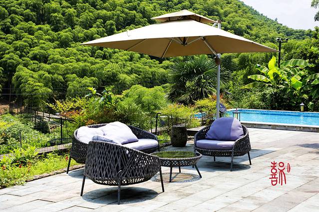 再往上行一个坡台才是酒店的正门,正门前的庭院里有一个对着青山的无边泳池,阳光下清澈透明的池水波光粼粼,泳池的高度在山腰上,徜徉在水面上时会觉得泳池池水的尽头与山林相接。在苍翠的背景下,无论是蓝天白云还是夜晚星空下,畅游于碧蓝的池水中,真是一种唯美的感官体验。,