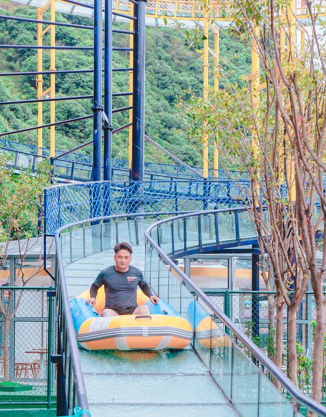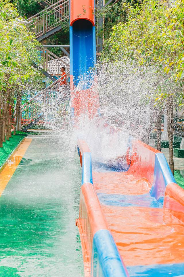 色彩缤纷的滑道,让你既玩的高兴又赏心悦目,游客头朝下趴在飞毯之上,水流的冲击与重力汇聚生成巨大的加速度,急速俯冲时身体悬离水面,顺流而下,浪花飞溅,犹如在天空彩虹上滑行。