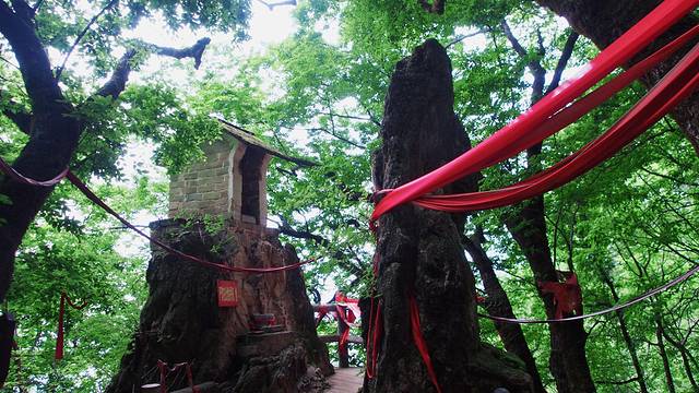 我们沿步道一路向上攀登,经通天梯到达景区最高点福寿亭,眼前的植被类型也发生了规律性的变化。由于地形地貌的原因,许多树木生长在悬崖绝壁之上,形成了独特的形态(如迎客松),这一切造就了塔云山四季不同的植被景色,也构成了塔云山的秀美和宜人的气候。