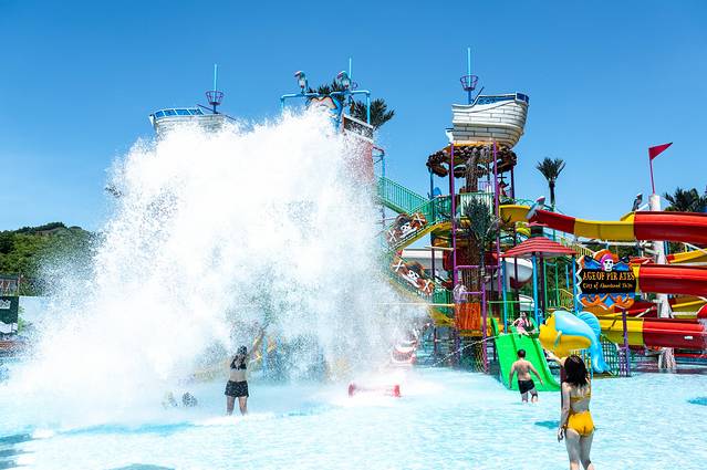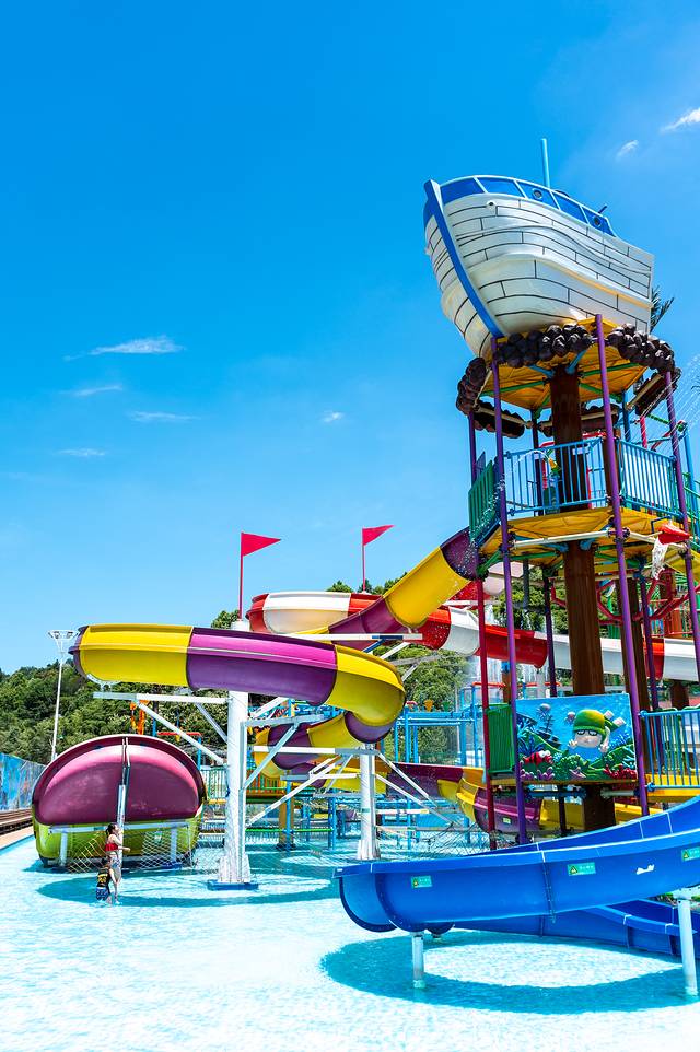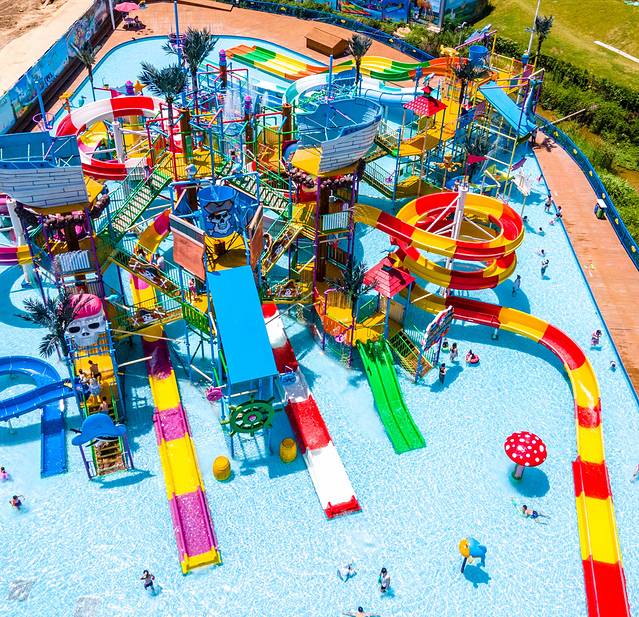 欢乐水寨是一座海盗主题风格的水上狂欢乐园,占地足足有2000平方米,汇聚了彩虹滑梯、螺旋滑梯、高速滑梯等12座滑梯,最长最刺激的螺旋滑梯有三层楼高,一滑而下的刺激感让我瞬间尖叫起来。遍布海岛风格的装饰本身就是一种刺激、狂欢的感觉。需注意,欢乐水寨需要穿泳衣才可以进去,记得来之前提前备着。