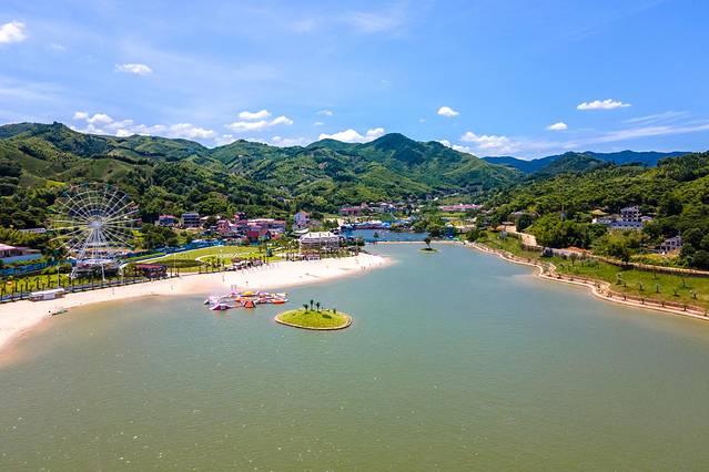 三面环山、水系丰富、坐拥广袤竹海的安吉,有着得天独厚的自然资源,是长三角热门的避暑玩水目的地。坐落在安吉县天子湖镇的荣耀天空之城为青山绿水所环绕,风光秀丽,空气清新,这里不只有浙江最长的高空玻璃漂流,更有着堪比三亚的阳光沙滩及丰富的水上娱乐项目。