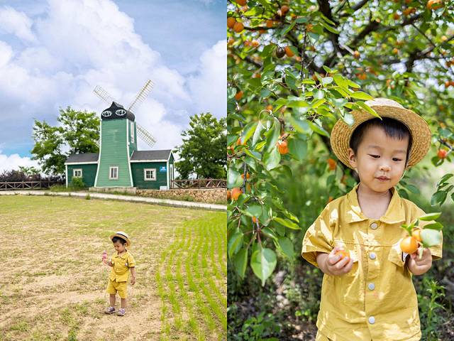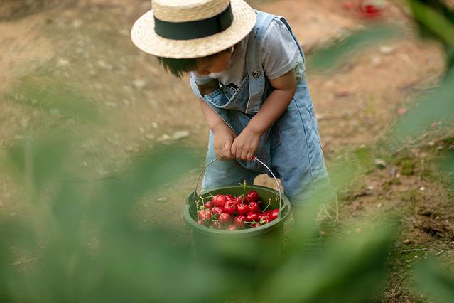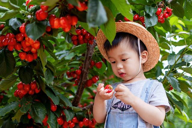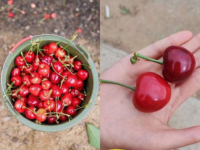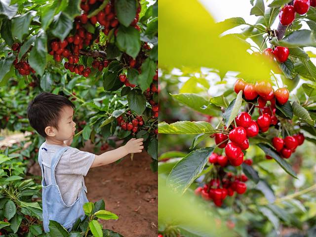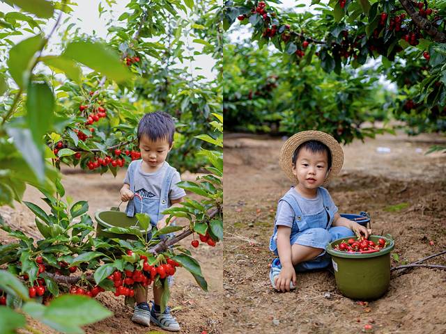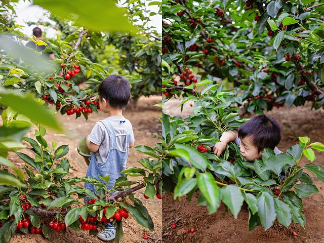 小朋友太开心了,站在树下提着小桶边吃边摘,小肚子吃得圆滚滚。樱桃价格也低到惊人,采摘每人30无限吃,25一斤买走,感天动地,要知道这可是巨无霸车厘子啊!返程时在机场见到的大樱桃要48一斤了,其实也不算贵,带一些回家都是美好的心意。