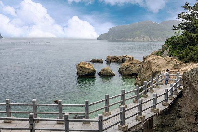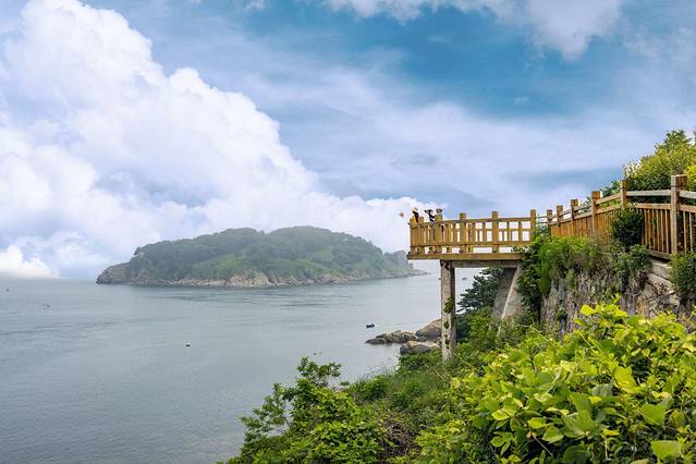 小水口森林公园,位于小长山岛滨海之岸,是国际级3A景区,森林覆盖率达到80%,生机勃勃的森林邂逅蔚蓝海洋的美丽景观张开双臂,沿着海岸线走一走上上下下的木栈道,一路上怪石嶙峋,木栈道全长达550米,坚持走就会踏上一段30多米长的玻璃栈道,脚下的大海波涛汹涌,坐下来拍照分分钟出大片。