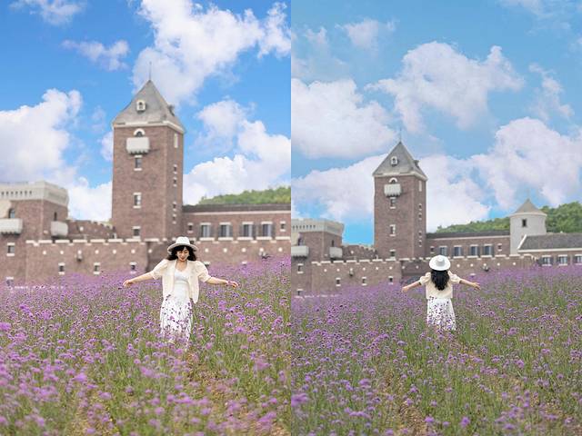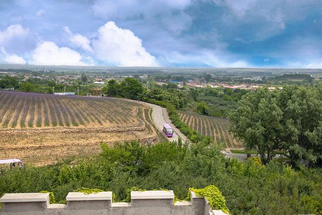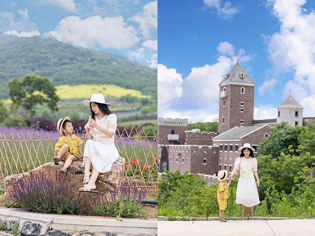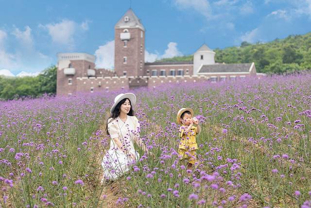 紫云花汐薰衣草庄园位于大连市金州区,占地1000多亩,成片生长着薰衣草、玫瑰、马鞭草、鼠尾草、玫瑰花等。花开漫山遍野,紫色花海中间有一座雄伟的古堡,穿过林间山路登上罗马城堡,一路上杏树李子树结满了果子,站在城堡上可以俯瞰日之初广场及薰衣草花田,花田中的代步车都是紫色的。