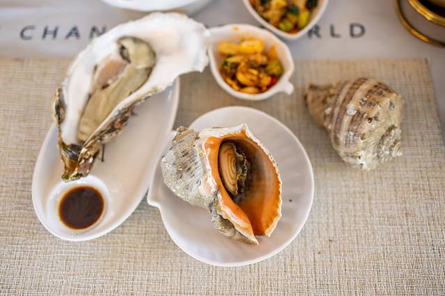 中午吃到了很特别的海鲜大餐,一人一份的海鲜料理,两人一锅煮鱼肉饺子。年轻的员工进进出出厨房,将一个个碟子一份份小菜仔细摆放到眼前,比巴掌还大的生蚝、拳头大的海螺、饺子馅里的鱼是早晨新鲜打捞上来的海鱼。海豹一个人吃掉了整个三文鱼头。好吃的午餐。