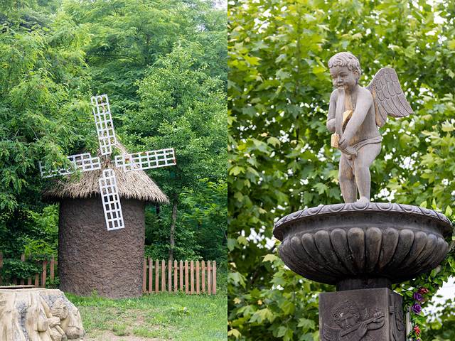 🌼日之初广场,欧式小屋建筑,石木造型广场,爱神丘比特雕塑喷泉爱墙,秋千、有荷兰大风车、婚礼老爷车、木草亭。