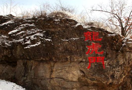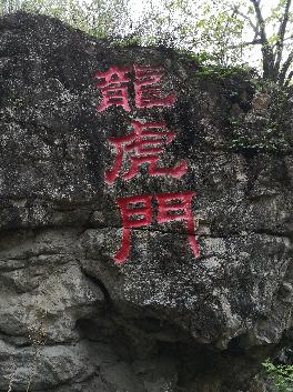 一路上景色一般,山路有很大一段为土石路,路边的石柱上没有栏杆,显然没有完工,然而现已无人继续施工了。因为没有过度开发,景色仍为原汁原味纯天然。因为游客少,非常清静。沿着山路走了一段时间后,来到一座小山旁,山的一侧刻有“龍虎门”。小山上虽刻有龍虎门三个大字,但实在看不出门的形状。