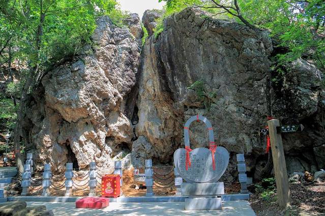 长相爱,同一对天造地设、欲吻末接的奇峰组成。两座石峰左为男高10.5米,右为女高10米,酷似一另一女相拥相依,情意缠绵。这组奇峰承接了天地灵气,至今也是人们祈盼爱情美满、祝福家庭和睦的祈福道场之一,锁链代表䛫相爱的男女永不分离。
