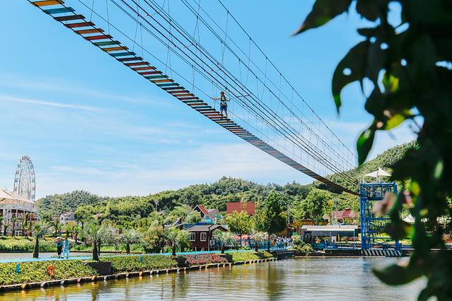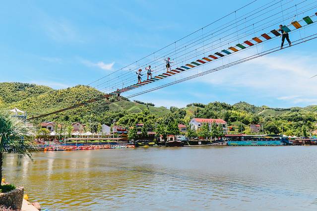 “步步惊心”看似是一条普通的吊桥但仔细一看——中间居然是镂空的,一路上即便安全防护周全你也依旧会心跳加速,全长约150米,距离地面高达25米左右,抬头是蓝天白云,低头是幽深湖水,间隔约30厘米的木板距离,让人随时都有踩空的感觉,再配上晃动的桥身,简直堪称步步惊心,这一种将美景尽收眼底的感觉真是太棒了!