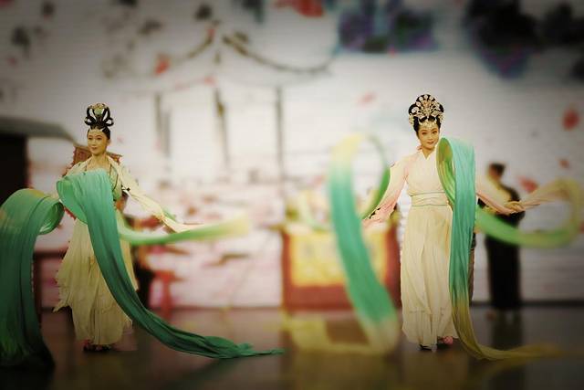 川剧和绸舞蹈的结合,川剧名旦演绎优美水袖,在一抛一接之间,完成丰富多姿的舞蹈动作,尽显独特的创意与智慧。