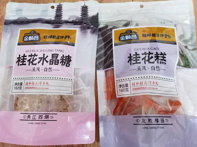 当然,桂林的美食不仅仅限于米粉这一样,还有荔浦芋头扣肉、阳朔啤酒鱼、龙胜竹筒鸡、竹筒饭(饭是糯米饭,其中还加入了当地烟熏的腊肉)、烧鹅、桂花糕、桂花糖等等~~~~~~这里的桂花糕、桂花糖也是非常有名的,很适合作为伴手礼送给亲朋好友,在行程即将结束的时候,我们也在当地的连锁店里买了很多带回来,价格也很亲民,桂花糕、桂花糖的袋装价都是五袋48元,是不是性价比极高哟!