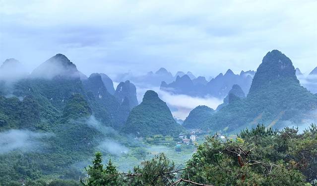 第四天我们的行程是最为丰富的,主要游览的景点有,相公山、十里画廊、遇龙河(富里桥),晚上还去阳朔县城的西街转了转。相公山位于阳朔兴坪镇境内的漓江西岸,在黄布滩和九马画山两景点之间,距阳朔约28公里。登上相公山举目远眺,群峰排列有序,清澈的漓江蜿蜒流淌在群山怀抱中,在此也可以看到漓江第一湾。