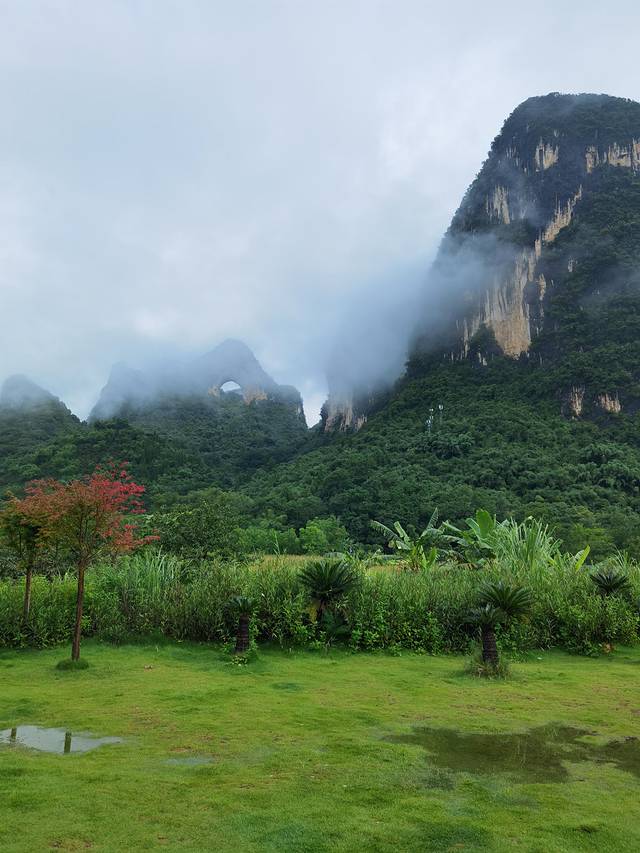 第五天下午我们就要返程了,所以上午我们就去十里画廊、月亮山、世外桃源三个景点游览了一下。月亮山是阳朔境内的奇景,它在高田乡凤楼村边,高达380多米。因为山顶是有一个贯穿的大洞,好像一轮皓月,高而明亮,所以人们叫它明月峰,俗称月亮山。