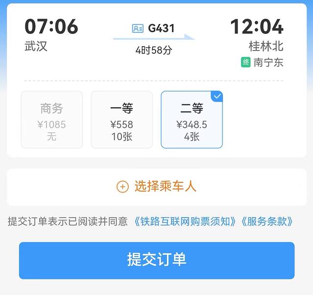 这里说的交通,既包括武汉至桂林往返的交通,还包括行程之中景点到景点、酒店到酒店的交通。首先说说往返的交通吧,如果想规避旅行中“掐头去尾”的怪现象,建议大家乘坐以下两个车次的高铁往返武汉和桂林,这样在第一天和最后一天就有更充足的时间来游览桂林的相关景点,而且人也不会觉得太累。