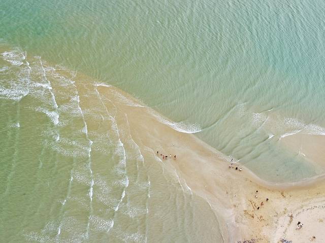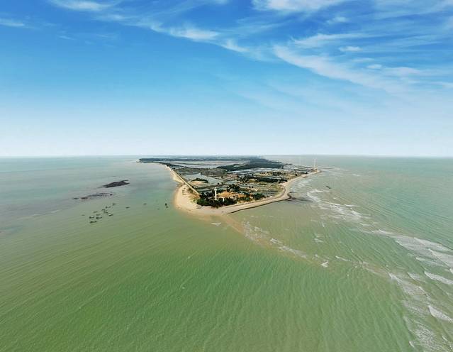灯脚楼对外海面尖尖的沙洲就是琼州海峡与北部湾交汇处,自东向西的琼州海峡潮流和自北向南北部湾潮流在这里互相激荡形成独特的“十字浪”,这就是著名的“合水线”海上奇观。