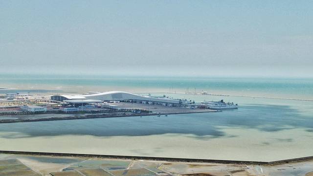 虽然海边的风挺大,但我还是将无人机放了出去一顿猛拍!16个5000吨级客货滚装泊位一字排开超霸气!1个5000吨级危险品专用滚装泊位在防波堤旁很专业!