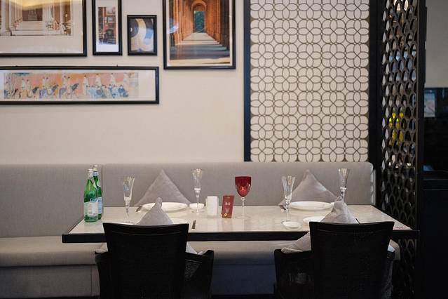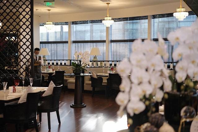 柔和的灯光隐现餐厅内部一丝不苟的细节处理,以原木色、米色及银灰色系为主的餐具和摆盘,洋溢着典雅气质。