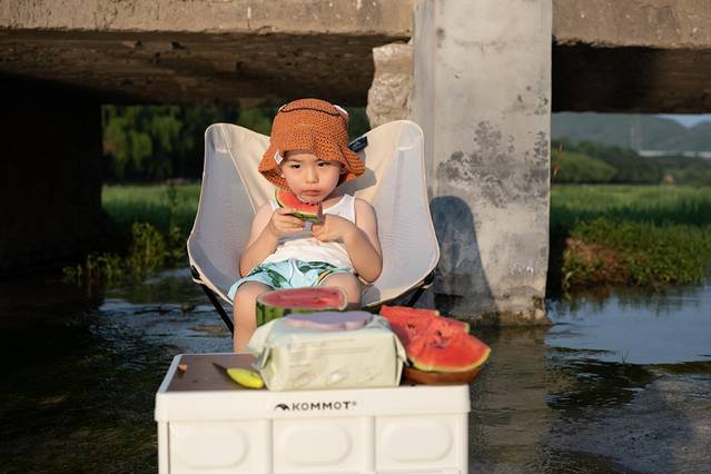 我们带着KK小朋友,把露营桌椅搬到了溪边,还带了一个清凉的西瓜。