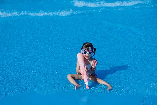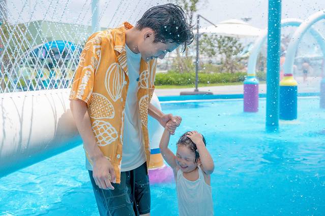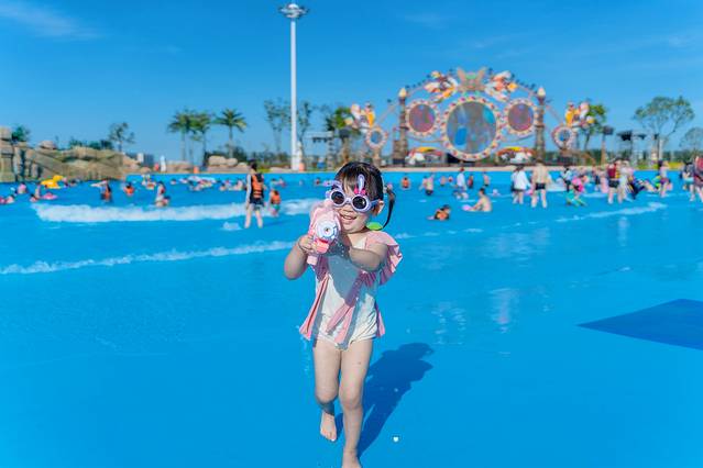 夏日的午后,来到室外水乐园,造浪池一定是最受欢迎的景点,蓝色的池底映衬着海浪都是绿色的,就像是大海的颜色一般,再加上仿真的浪花,真的会给人一种身处在海滩边的错觉。云宝也是对这里格外的中意,跟着舞台上的舞蹈演员一起扭动,坐在水中任由海浪不断的拍打,亦或是拿着水枪跟旁边的小朋友打水仗,她是那般的快乐开心。
