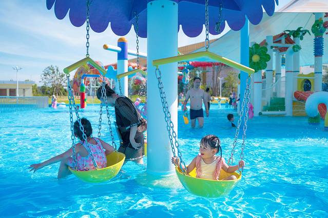 带着云宝不断的体验着不同的设施,这里的玩乐真的是超出我想象的丰富,面积也比室内水乐园大得多,毗邻室内水乐园的是一个儿童戏水区,它有个好听的名字,叫做精灵许愿池,这里有儿童版的滑梯水池和精灵水堡,滑梯是专门为小孩设计的,高度低坡度缓,滑梯的外表也是五颜六色的煞是好看,而且还有非常有意思的水上秋千,小朋友最爱的玩乐。