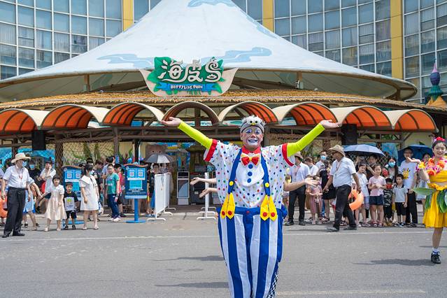 在海皮岛乐园,开园也是满满的仪式感,上午十点,伴着欢快的音乐声,丑萌的小丑、可爱的大白熊、靓丽的女生,他们载歌载舞,在水乐园的大门给即将入园的游客献上了一场快乐的舞蹈——海岛之约《快乐出发》。