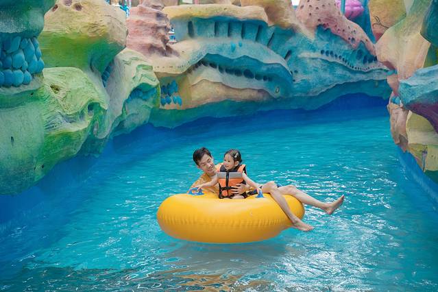 夏天,除了水乐园之外,最吸引我的便是漂流了,未曾想到的是,在这里居然也能体验到漂流。在海皮岛室内水乐园,有一个海底漂流,极其逼真的海底造景,两旁处处都是仿真的珊瑚、海螺、鱼群,带着云宝坐在皮划艇上,云宝对两旁造景无比的好奇,沿着水流不断向下,时而平缓时而快速,刺激与舒适并存,非常有趣的体验,这也是云宝最喜欢的玩乐,一直让我不断地带她重新排队重新漂一次。