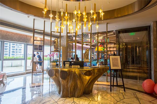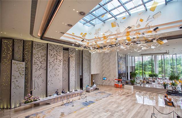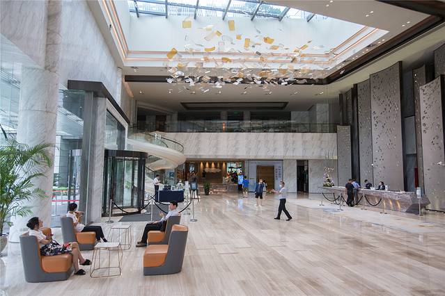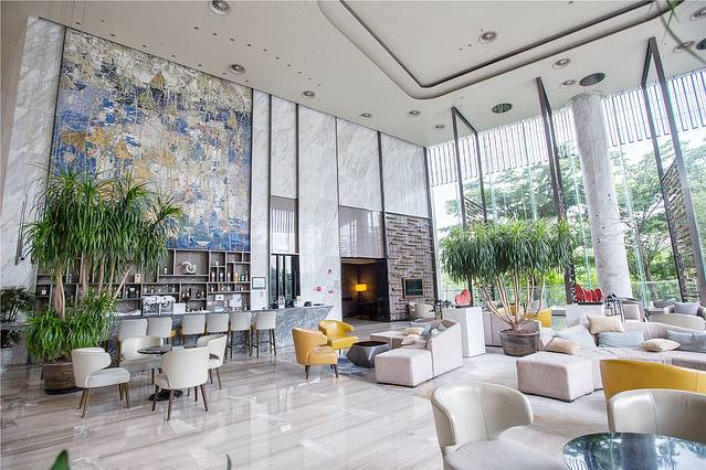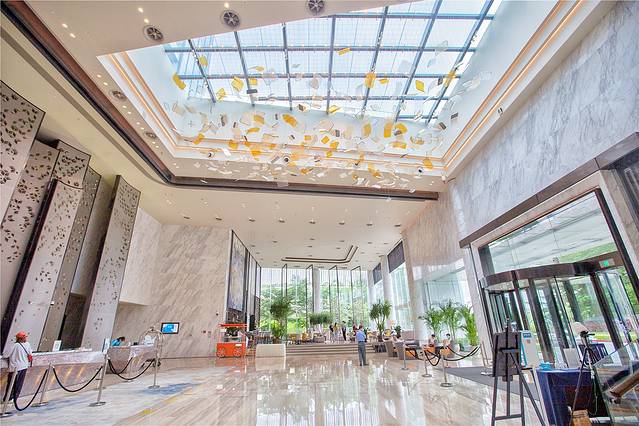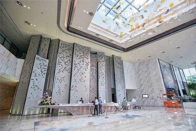 广州南沙越秀喜来登酒店的酒店大堂亮点很多,设计充满南沙水乡文化气息,酒店前台采用富有设计感的石材,仿佛是一艘扬帆起航的帆船。