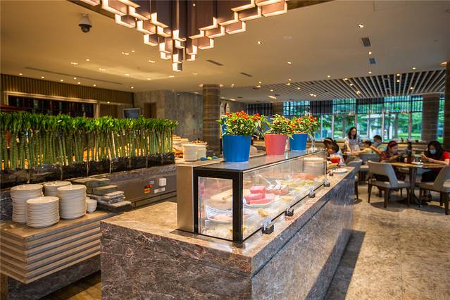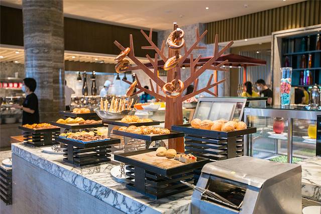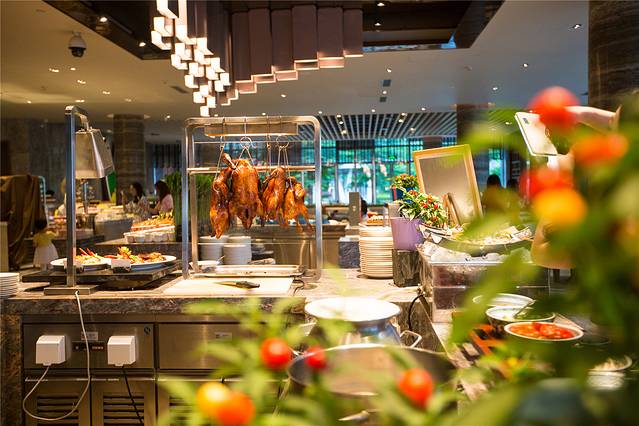 自助餐厅内设有多个开放式餐台,由厨师现场烹制各地美食,不仅是味觉满足,同样也是视觉盛宴。