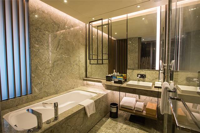 明亮宽敞的浴室,瓷砖格调大气奢华,内配了浴缸、淋浴间,出门在外也能享受到品质生活。