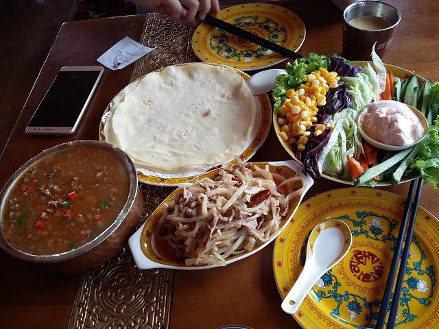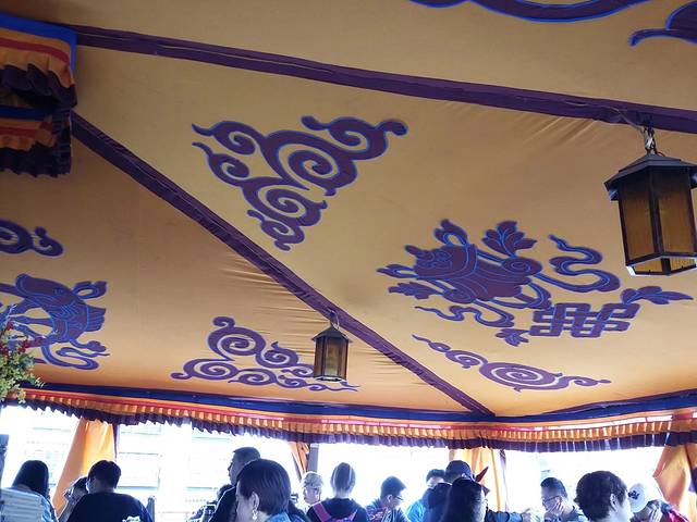 猛烈的日光似乎要穿透我的墨镜, C说去网红店玛吉阿朵吃饭歇脚吧。传说里仓央嘉措的故事引来了很多游客,店里面人声鼎沸,熙熙攘攘。在二楼找了个地方坐下,开始点单,发现坐在窗边看八廓街街景倒是个很好的视角,就是人多了些些,要是找一个雨天,看一天街景也是极好的经历吧。听见隔壁桌的老大爷在跟老伴埋怨,这么个地方有什么好吃的,非要来跟风......印象里就是贵,也没有觉得很好吃,感觉藏餐跟印度菜很像,土豆都是泥糊糊状,有点影响我的观感。而且一壶奶茶要68块,两个人点了喝不完,而光明茶馆只要1块,学校的饭堂也是一壶几块钱。