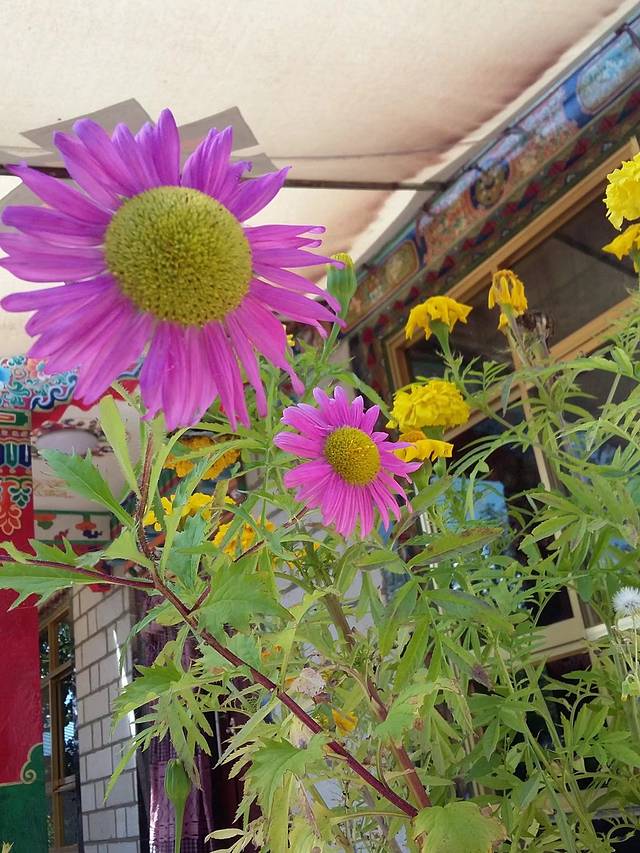 学校选的过林卡的地方不远。已经搭好的帐篷,里面摆着手把肉、酸奶还有一些吃食。避开人群,帐篷四周很大朵而原始的玫瑰花、波斯菊、草地还有一些艳丽的小菊花,很是招人欢喜。
