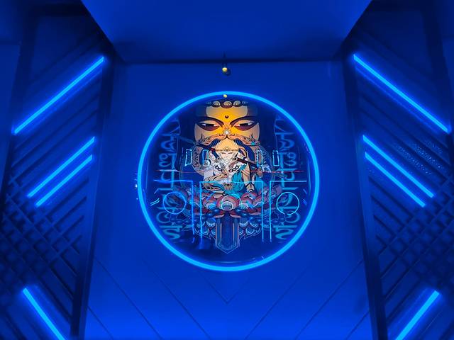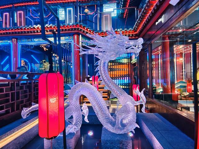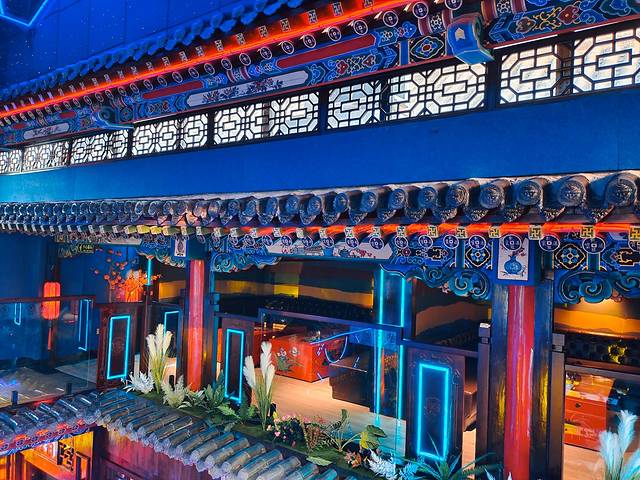 每个卡座也用上龙凤呈祥的装饰和图案显的更加的宫廷风气息。环境加上灯光效果的加持就很有国漫里的氛围,科技感十足。