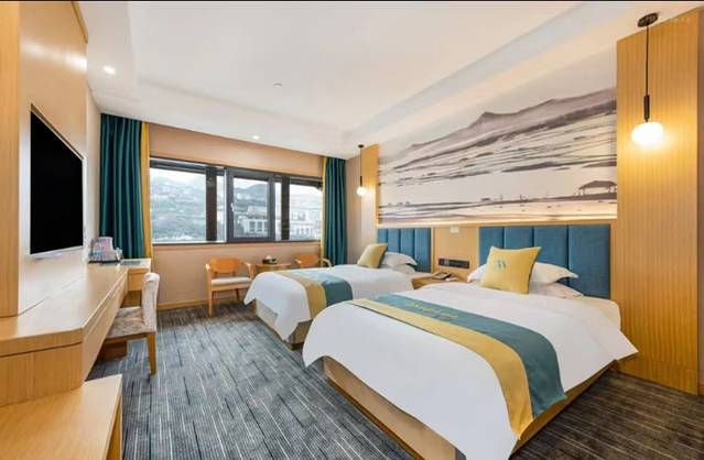 贵州茅台镇仁怀香漫大酒店的位置很不错,高低错落地修建在半山上,被一众古色古香的建筑、街道、商业街所簇拥。窗帘拉开,往远处看,是茅台镇最棒的景色:夜幕降临,古镇灯光熠熠,霓虹闪烁,灯球投影,犹如一幅美丽的画卷使人在不知不觉中沉迷与这美景中。
