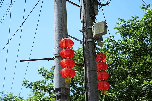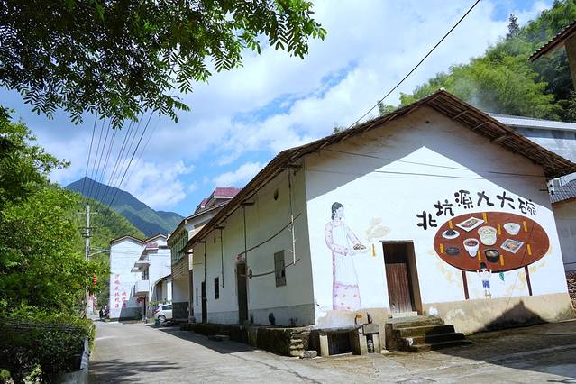 躺在山脚的宁静村庄,给我们一种似曾相识的感觉。远处房屋腾起阵阵炊烟,风中夹带着丝丝柴火的气息,这种熟悉而回不去的味道将我们闹腾的心又收了回来,步伐徐徐,似乎在等待着谁的一声呼喊。村口的电桩上挂着红灯笼,不是逢年过节却也和谐。灰白墙上贴着大壁画“北坑源九大碗”,房顶黝黑的瓦片冒出层层炊烟,让人不由得臆想这其中到底是什么滋味儿来。