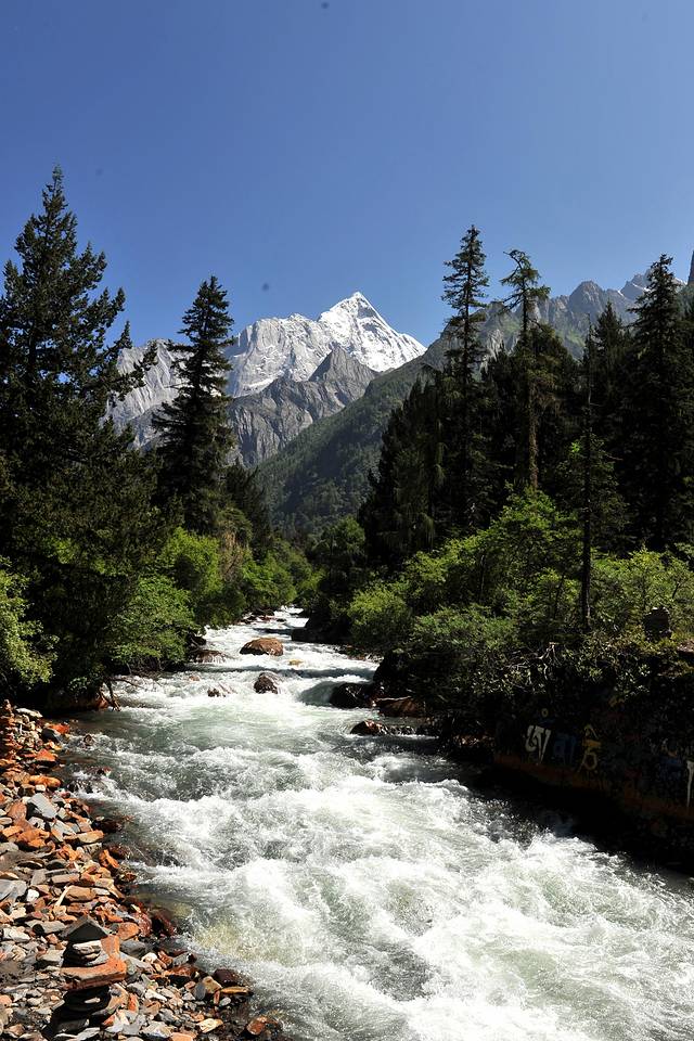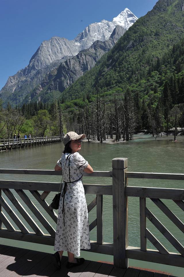 早上五点多醒来了,听到外面奔涌的水流声,看到窗户上全是水气,就知道外面温度有点低。大家洗漱完吃好早餐,直接步行去往游客中心,八点半已经排起了几米长的队伍,扫了行程码,刷了身份证开始等观光车。没几分钟,就到了观光车下车点。从这里可以清晰看到幺妹峰的雪,其他几座山尖已经不是雪山了。路边有一大群马等在路边。都在问:骑马吗?看了下价目表,全程单边得400,娃很心动,刚下车就说:”妈妈我想骑马。“因为给他打过预防针:“在景区不能任性,如果骑马价格太贵的话,我们就不在景区骑,后面到了草原上骑马更便宜。”拉着娃往景区里走,第一站就是斯古拦寺(也叫喇嘛寺),寺门锁着。我们往虫虫脚瀑布走去,一路上走走停停,人不算太多,里面挂着很多牌子,各种植物、动物,看到有独狼、黑熊之类的图片,让娃不要放单,一定要跟紧人群。娃耍赖了好久,终于哄到了枯树滩,这一次娃说啥也不愿再走了。因为上面还有下干海子和上干海子,我和娃爹想着再往上走走,让娃和老妈在枯树滩歇着等我们。枯树滩越往上,游客越来越少,心里反倒有点怕怕的。在一处河边脱了鞋,那水温不是一般的冰啊,脚进去几秒就扛不住,照没拍好就直嚷:”太冰啦受不了受不了!“拍了几张照片,赶紧穿鞋。走进一处凉亭,有两匹马悠然自得的吃草,有游客喂给它手撕面包,它也吃得挺开心,在这里我还被蜂蛰了一下,又麻又痛的感觉有点酸爽。好不容易走到下干海子,一脸懵,干海子是干的?不是我想像中那种阳光下蓝色的水面?至此,娃爹也觉得又饿又热,走不动了。在旁边买了份30块一份的土豆牛肉饭,要了五串肉串(15块),我就吃了两串肉串,饭是不想吃了。“娃已经往出口处先走了,我们走到枯树滩决定骑马到出口,石子路忽上忽下,屁股颠得有点疼,腰也觉得疼,下得马来,一步都不想走了。走到斯古拉寺门口,旁边的游客说:”啥呀,越进去越觉没看头,不如就站这里看着幺妹峰雪山,倒觉得挺壮观的!“我疯狂附和:“对呀对呀,走得人太累啦!”景区出来,也没想好去哪里,因为想去金川情人海,所以今晚就住马尔康了。到达马尔康已经晚八点多了,娃爹走路走得脚痛腰痛,我只好出来买了点饭菜打包回宾馆吃。